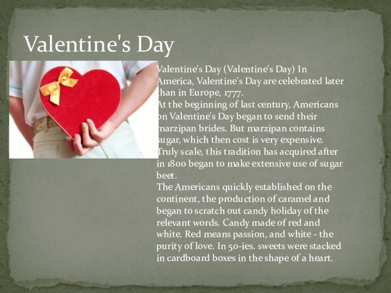 At the beginning of last century, Americans on Valentine's Day began to send their marzipan brides. But marzipan contains sugar, which then cost is very expensive. Truly scale, this tradition has acquired after in 1800 began to make extensive use of sugar beet.