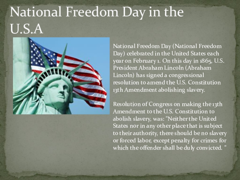 National Freedom Day in the U.S.ANational Freedom Day (National Freedom Day) celebrated in the United States each year on February 1. On this day in 1865, U.S. President Abraham Lincoln (Abraham Lincoln) has signed a congressional