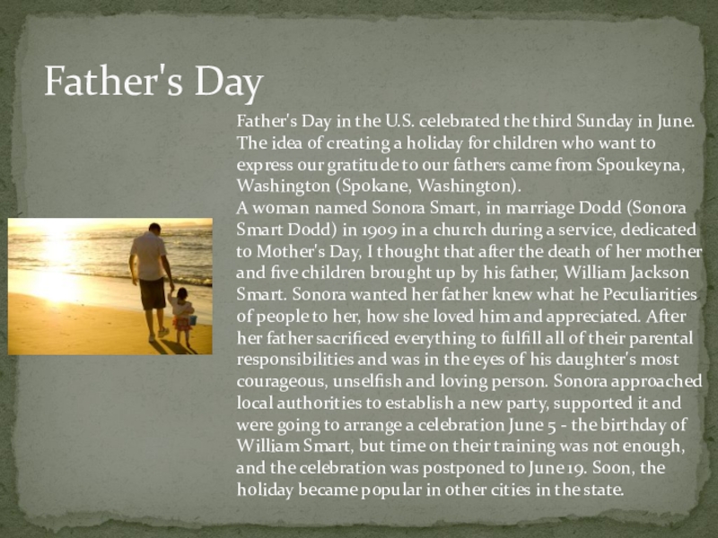 A woman named Sonora Smart, in marriage Dodd (Sonora Smart Dodd) in 1909 in a church during a service, dedicated to Mother's Day, I thought that after the death of her mother and five children brought up by his father, William Jackson Smart. Sonora wanted her father knew what he Peculiarities of people to her, how she loved him and appreciated. After her father sacrificed everything to fulfill all of their parental responsibilities and was in the eyes of his daughter's most courageous, unselfish and loving person. Sonora approached local authorities to establish a new party, supported it and were going to arrange a celebration June 5 - the birthday of William Smart, but time on their training was not enough, and the celebration was postponed to June 19. Soon, the holiday became popular in other cities in the state.