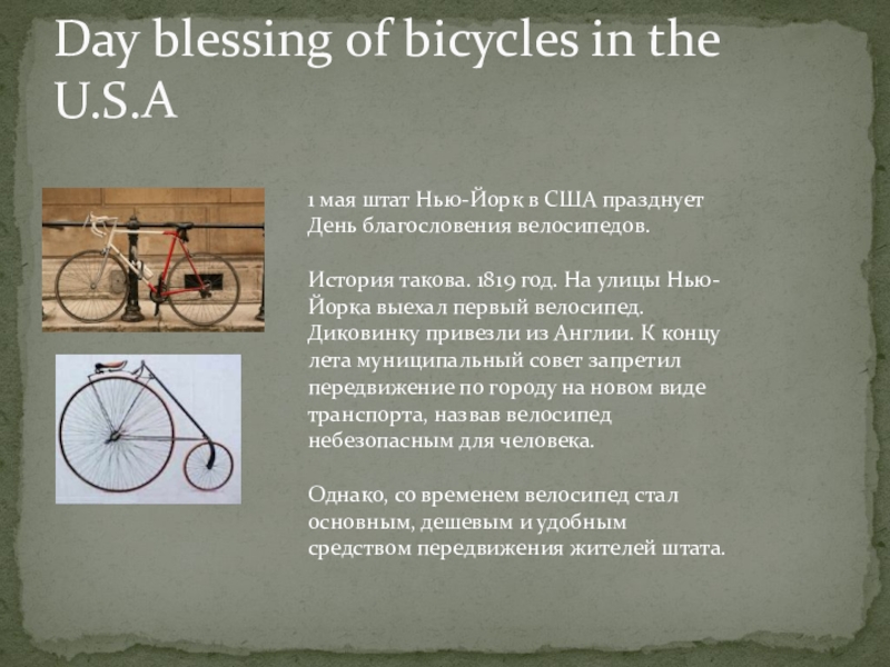 История такова. 1819 год. На улицы Нью-Йорка выехал первый велосипед. Диковинку привезли из Англии. К концу лета муниципальный совет запретил передвижение по городу на новом виде транспорта, назвав велосипед небезопасным для человека.
