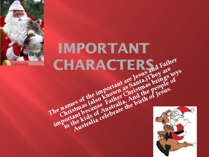 Important charactersThe names of the important are Jesus and Father Christmas (also known as Santa.)They are important