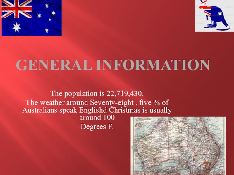 General informationThe population is 22,719,430.The weather around Seventy-eight . five % of Australians speak Englishd Christmas is usually around 100Degrees F.
