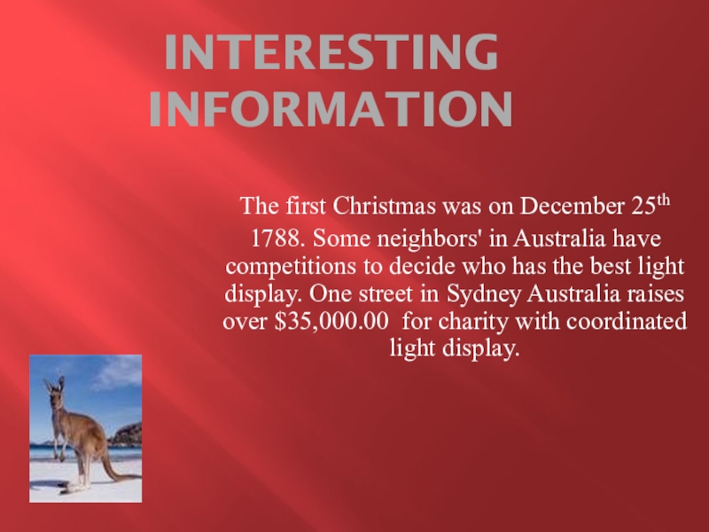 Interesting Information The first Christmas was on December 25th1788. Some neighbors' in Australia have competitions to decide