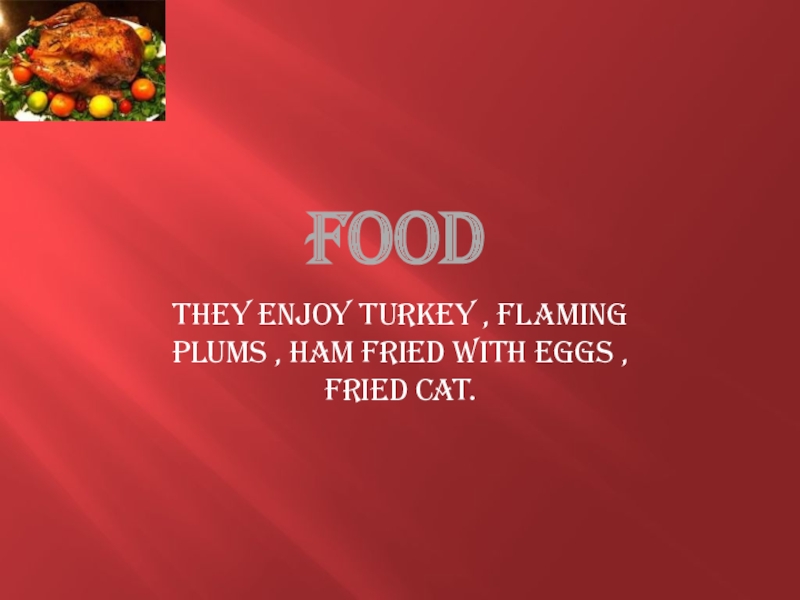 FOODThey enjoy turkey , flaming plums , ham fried with eggs , fried cat.
