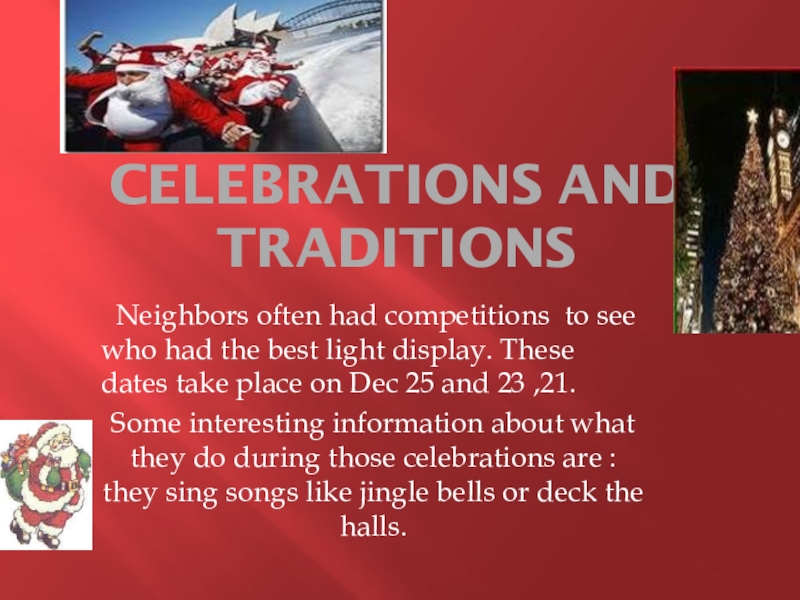 Some interesting information about what they do during those celebrations are : they sing songs like jingle bells or deck the halls.