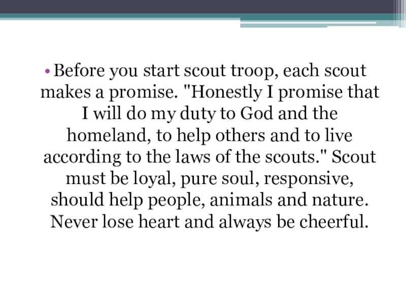 Слайд 9Before you start scout troop, each scout makes a promise. "Honestly