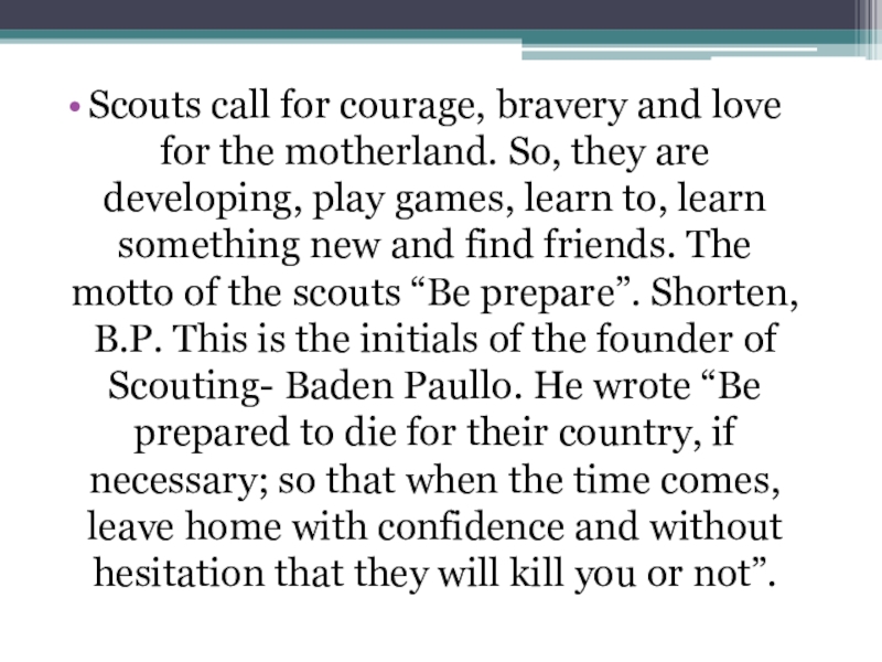 they are developing, play games, learn to, learn something new and find friends. The motto of the scouts “Be prepare”. Shorten, B.P. This is the initials of the founder of Scouting- Baden Paullo. He wrote “Be prepared to die for their country, if necessary; so that when the time comes, leave home with confidence and without hesitation that they will kill you or not”.