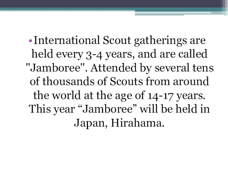 Слайд 4International Scout gatherings are held every 3-4 years, and are called