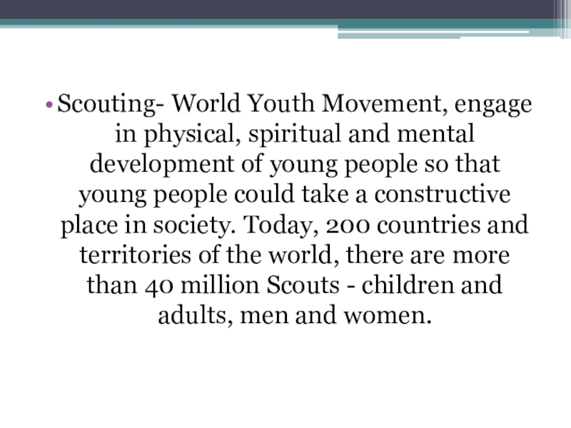 Слайд 2Scouting- World Youth Movement, engage in physical, spiritual and mental development