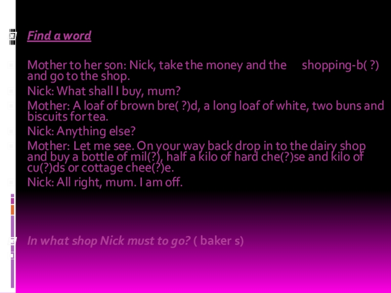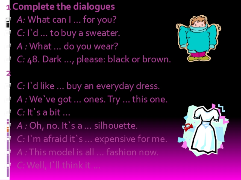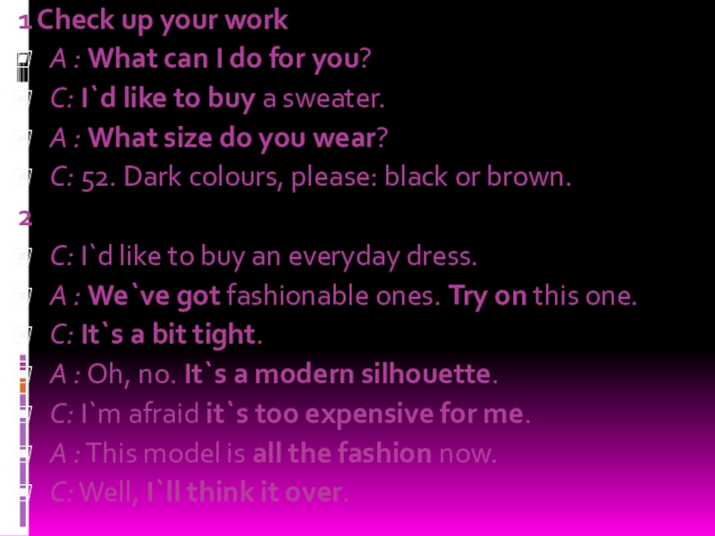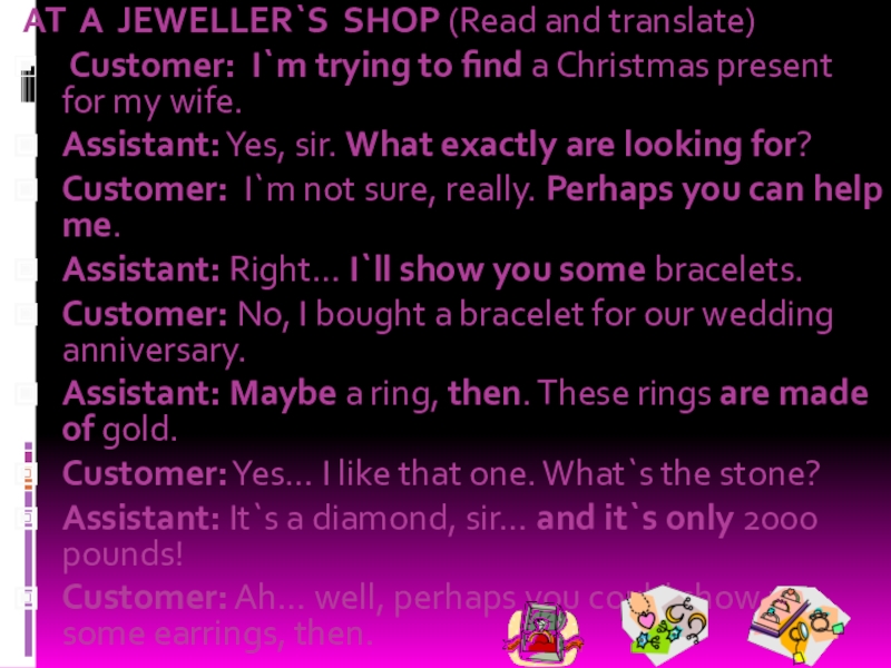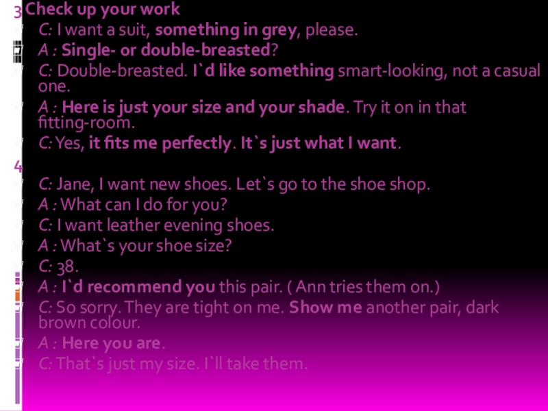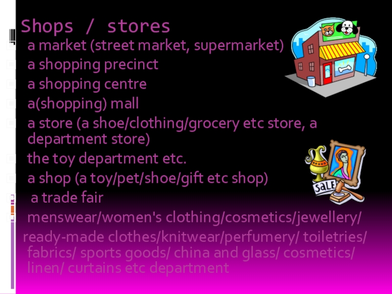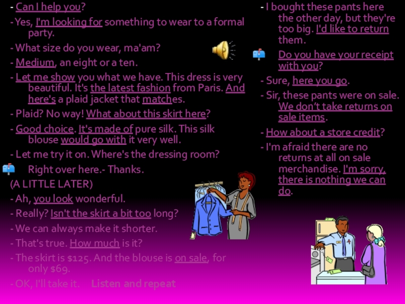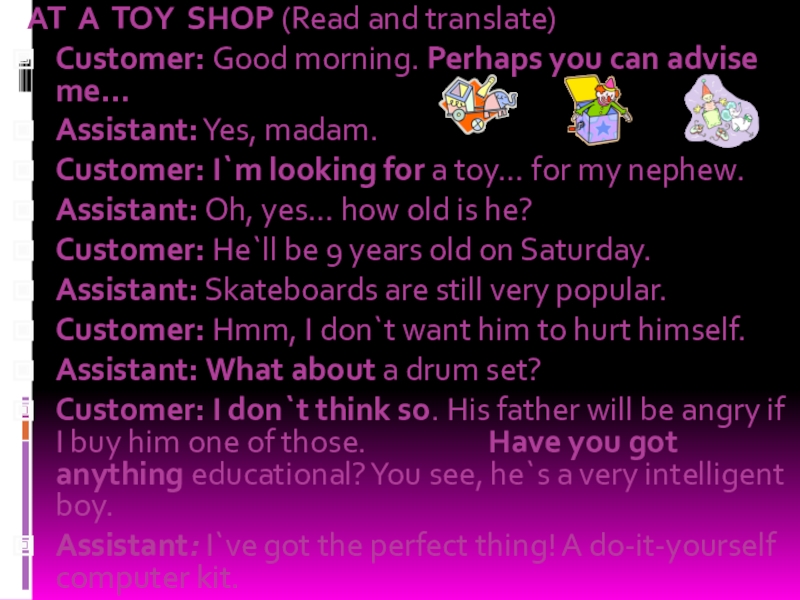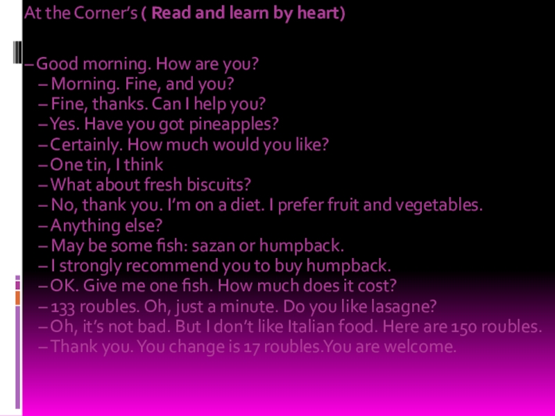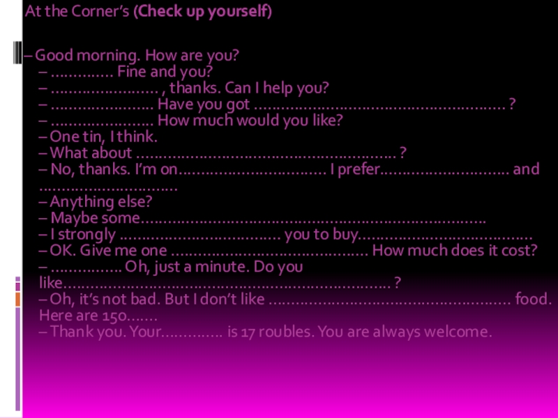 Методы торговли могут различаться. Существуют магазины самообслуживания, где покупатель ходит от прилавка к прилавку, выбирает и кладет в корзину то, что он хочет купить. Затем он несет корзину к контрольному прилавку, где стоимость покупок суммируется. Если же в магазине нет самообслуживания, то продавец помогает покупателю подобрать то, что он хочет. Вы платите деньги кассиру, а он дает вам сдачу.