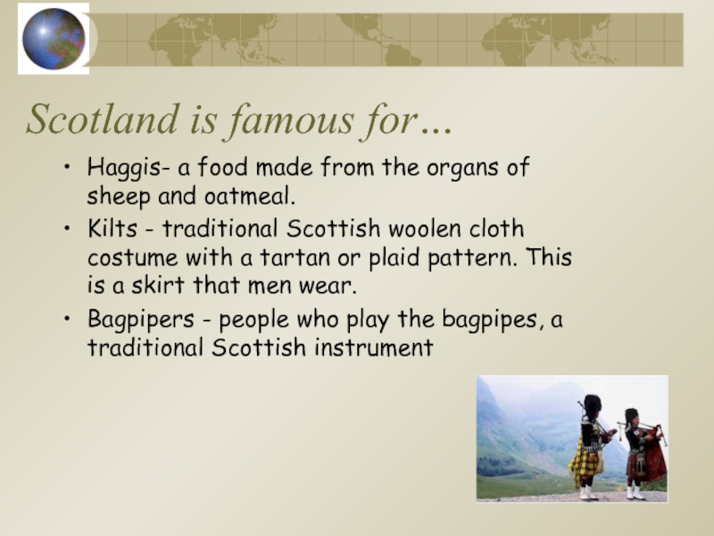 Kilts - traditional Scottish woolen cloth costume with a tartan or plaid pattern. This is a skirt that men wear.