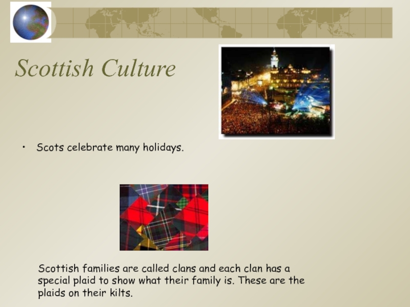 each clan has a special plaid to show what their family is. These are the plaids on their kilts.