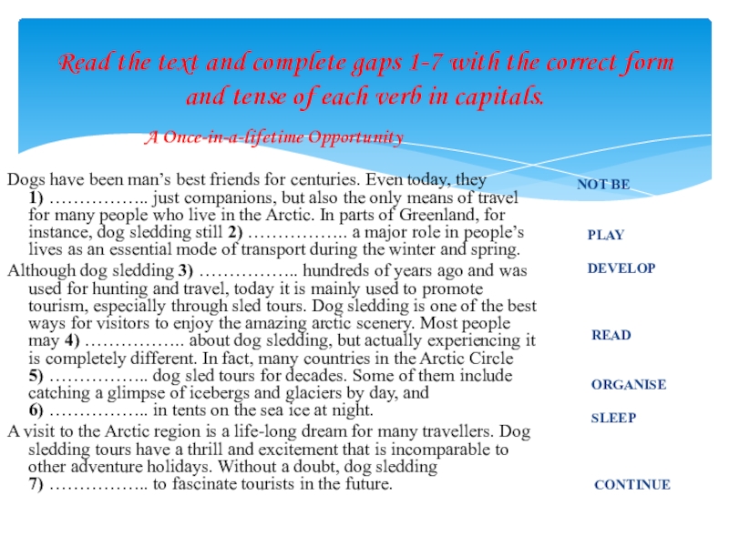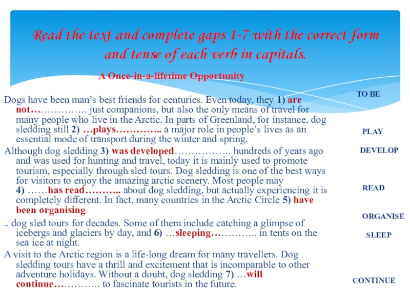 Although dog sledding 3) was developed…………….. hundreds of years ago and was used for hunting and travel, today it is mainly used to promote tourism, especially through sled tours. Dog sledding is one of the best ways for visitors to enjoy the amazing arctic scenery. Most people may 4) ……has read……….. about dog sledding, but actually experiencing it is completely different. In fact, many countries in the Arctic Circle 5) have been organisinghave