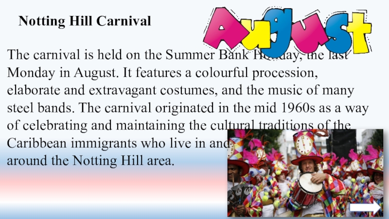 Слайд 29The carnival is held on the Summer Bank Holiday, the last