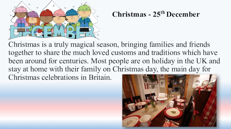 to share the much loved customs and traditions which have been around for centuries. Most people are on holiday in the UK and stay at home with their family on Christmas day, the main day for Christmas celebrations in Britain.