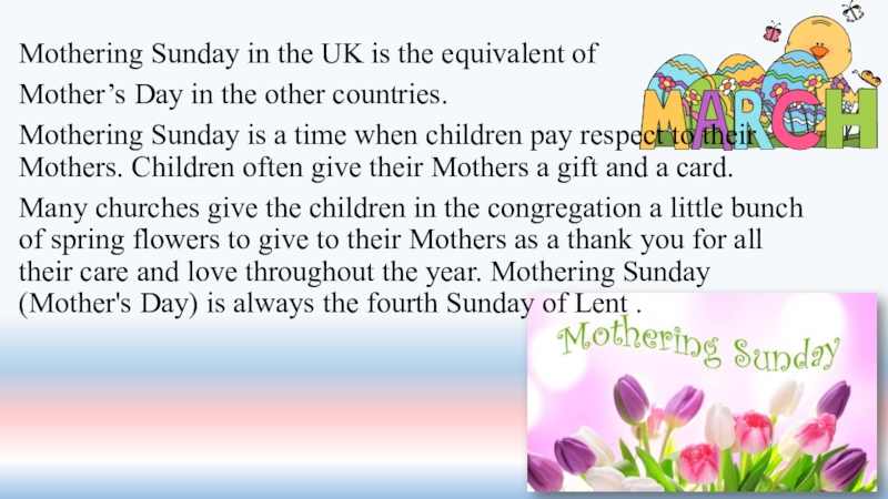 Слайд 13Mothering Sunday in the UK is the equivalent of