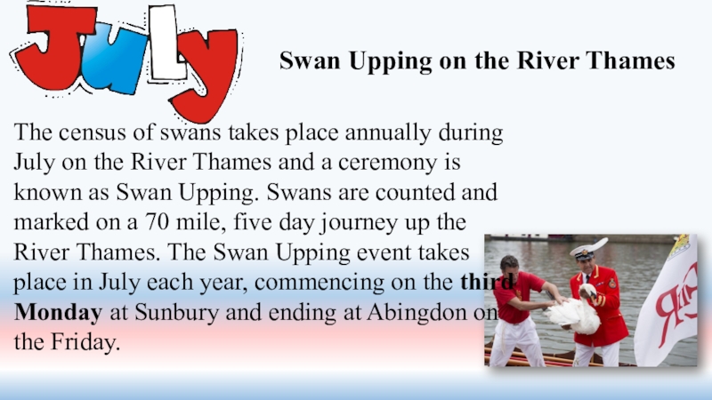 annually during July on the River Thames and a ceremony is known as Swan Upping. Swans are counted and marked on a 70 mile, five day journey up the River Thames. The Swan Upping event takes place in July each year, commencing on the third Monday at Sunbury and ending at Abingdon on the Friday.