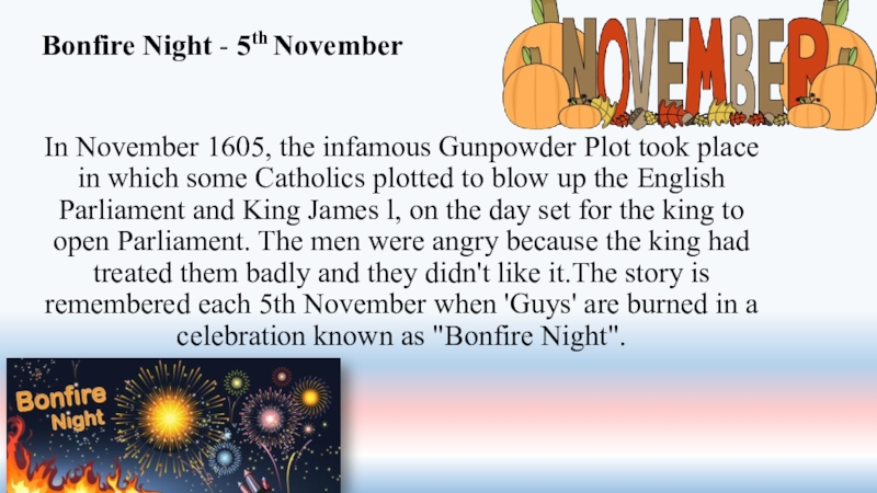 some Catholics plotted to blow up the English Parliament and King James l, on the day set for the king to open Parliament. The men were angry because the king had treated them badly and they didn't like it.The story is remembered each 5th November when 'Guys' are burned in a celebration known as "Bonfire Night".