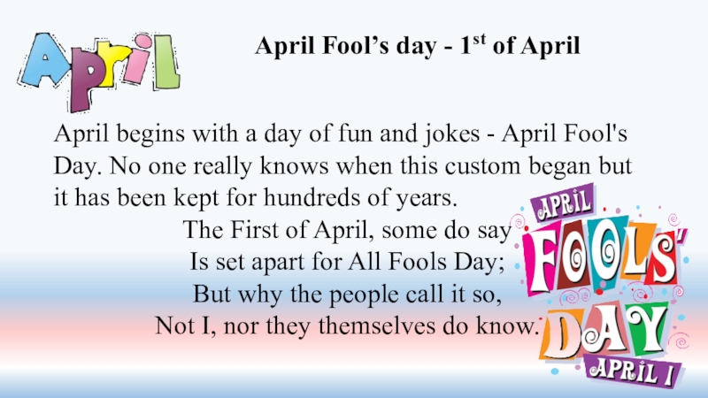 April Fool's Day. No one really knows when this custom began but it has been kept for hundreds of years.