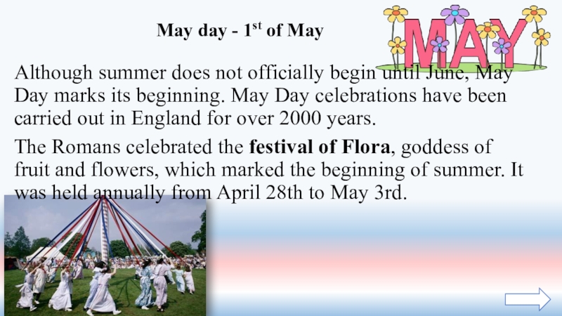 Слайд 21Although summer does not officially begin until June, May Day marks