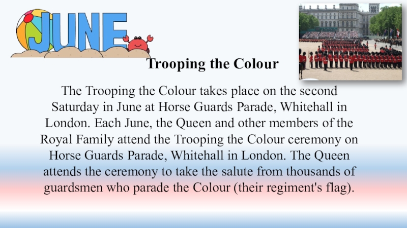 Слайд 23The Trooping the Colour takes place on the second Saturday in