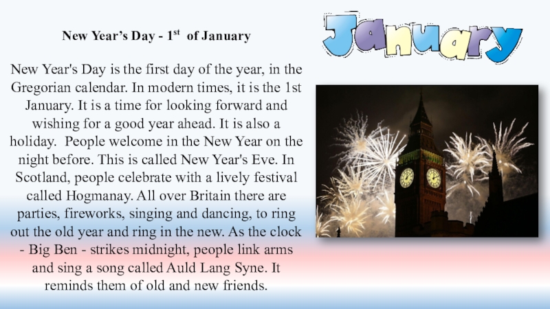 first day of the year, in the Gregorian calendar. In modern times, it is the 1st January. It is a time for looking forward and wishing for a good year ahead. It is also a holiday. People welcome in the New Year on the night before. This is called New Year's Eve. In Scotland, people celebrate with a lively festival called Hogmanay. All over Britain there are parties, fireworks, singing and dancing, to ring out the old year and ring in the new. As the clock - Big Ben - strikes midnight, people link arms and sing a song called Auld Lang Syne. It reminds them of old and new friends.
