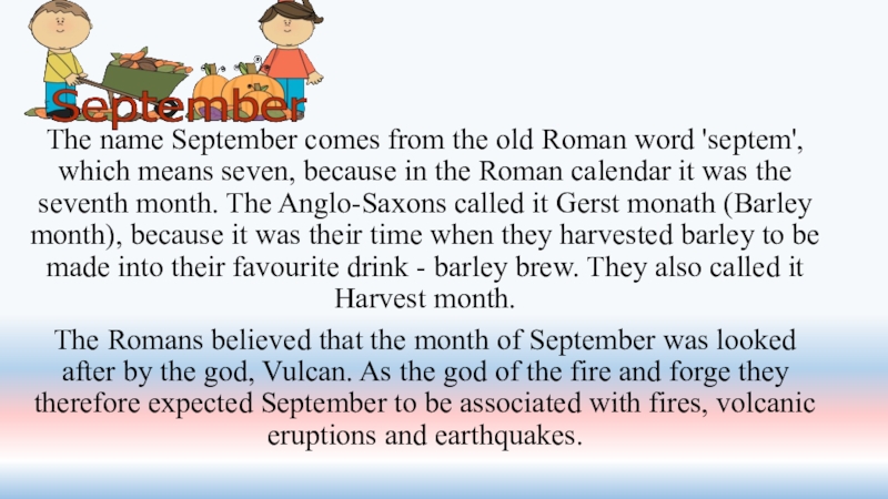Слайд 30The name September comes from the old Roman word 'septem', which