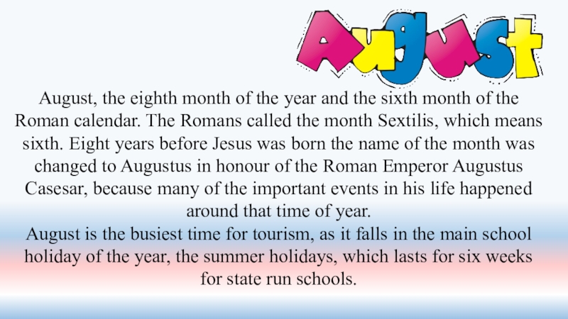 Слайд 28August, the eighth month of the year and the sixth month
