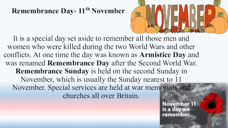 men and women who were killed during the two World Wars and other conflicts. At one time the day was known as Armistice Day and was renamed Remembrance Day after the Second World War. Remembrance Sunday is held on the second Sunday in November, which is usually the Sunday nearest to 11 November. Special services are held at war memorials and churches all over Britain.