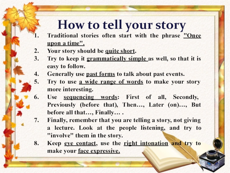 Finally, remember that you are telling a story, not giving a lecture. Look at the people listening, and try to "involve" them in the story.