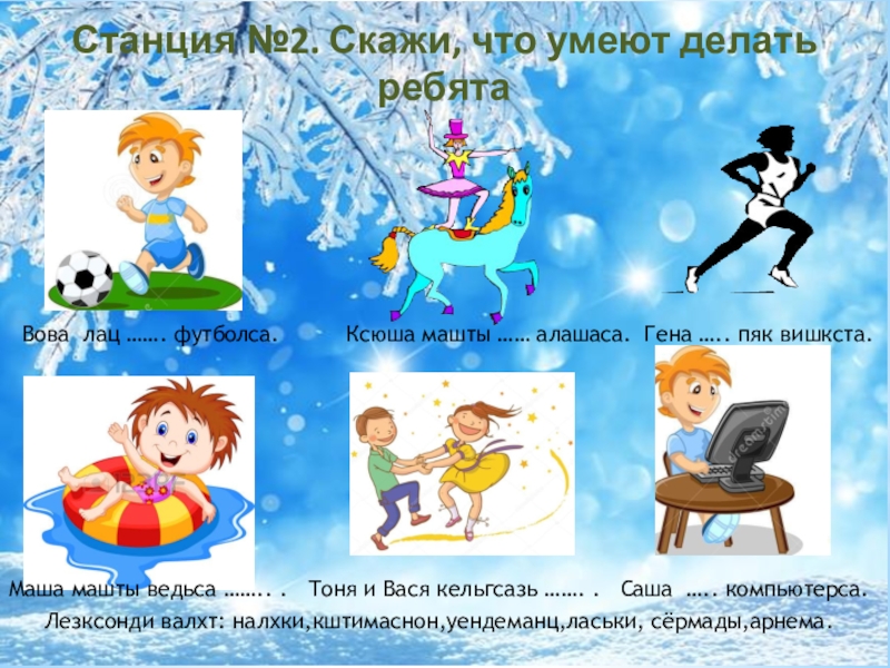 Маша машты ведьса …….. . Тоня и Вася кельгсазь ……. . Саша ….. компьютерса.
