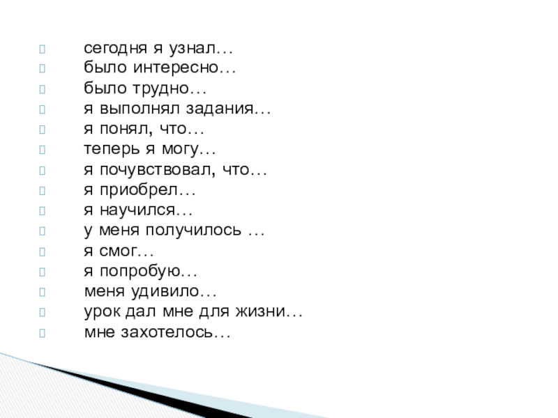сегодня я узнал…     было интересно…     было трудно…     я выполнял задания…     я понял, что…     теперь я могу…     я почувствовал, что…     я приобрел…     я научился…     у