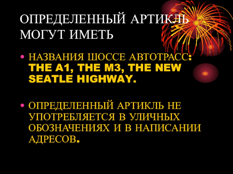 ОПРЕДЕЛЕННЫЙ АРТИКЛЬ МОГУТ ИМЕТЬНАЗВАНИЯ ШОССЕ АВТОТРАСС: THE A1, THE M3, THE NEW SEATLE HIGHWAY.ОПРЕДЕЛЕННЫЙ АРТИКЛЬ НЕ УПОТРЕБЛЯЕТСЯ