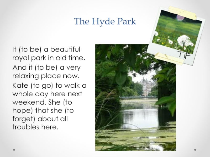 Kate (to go) to walk a whole day here next weekend. She (to hope) that she (to forget) about all troubles here.
