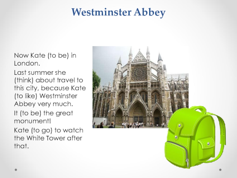 about travel to this city, because Kate (to like) Westminster Abbey very much.