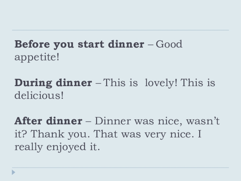 Слайд 6Before you start dinner – Good appetite! During dinner – This is
