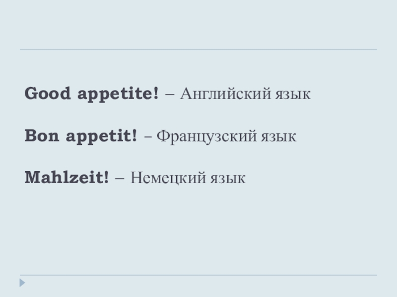 Good appetite! – Английский язык  Bon appetit! – Французский язык  Mahlzeit! – Немецкий язык