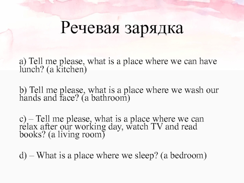 Речевая зарядкаa) Tell me please, what is a place where we can have lunch? (a kitchen)b) Tell