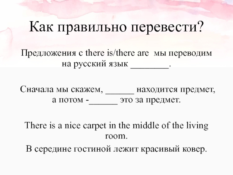 Как правильно перевести?Предложения с there is/there are мы переводим на русский язык ________.Сначала мы скажем, ______ находится