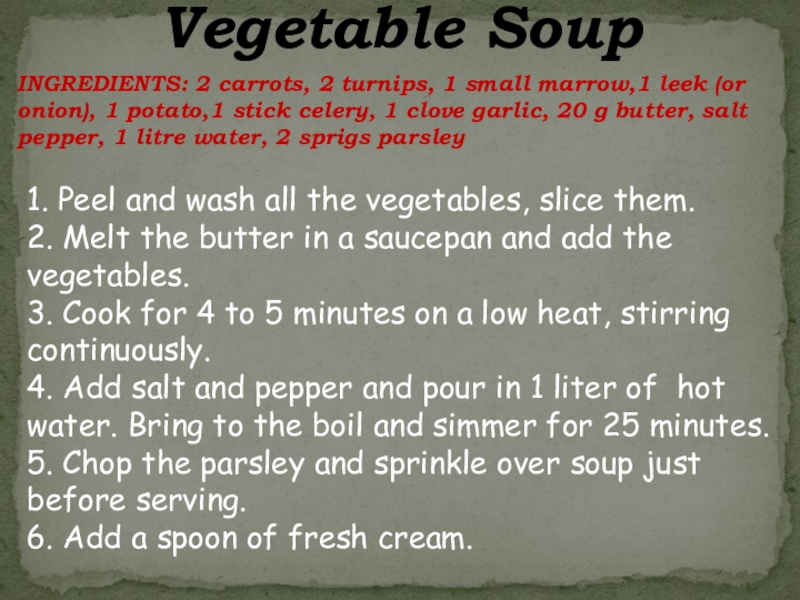 INGREDIENTS: 2 carrots, 2 turnips, 1 small marrow,1 leek (or onion), 1 potato,1 stick celery, 1 clove garlic, 20 g butter, salt pepper, 1 litre water, 2 sprigs parsley