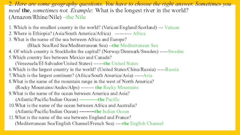 1. Which is the smallest country in the world? (Vatican\England\Scotland) --- Vatican