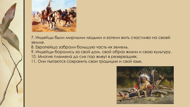 7. Индейцы были мирными людьми и хотели жить счастливо на своей земле. 8. Европейца забрали большую часть