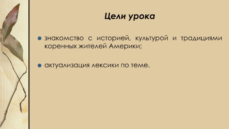 Цели уроказнакомство с историей, культурой и традициями коренных жителей Америки;актуализация лексики по теме.