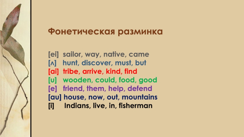 Фонетическая разминка  [ei] sailor, way, native, came [ʌ]  hunt, discover, must, but [ai] tribe, arrive,