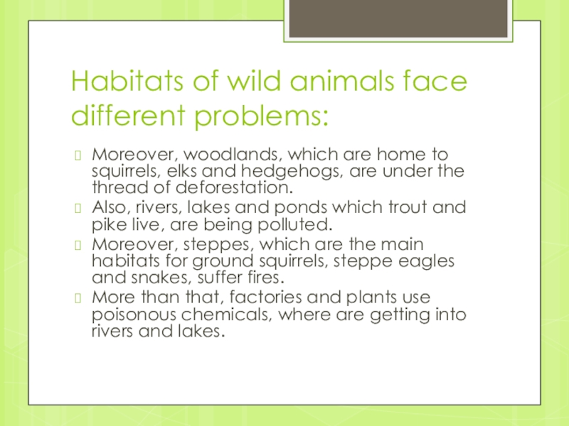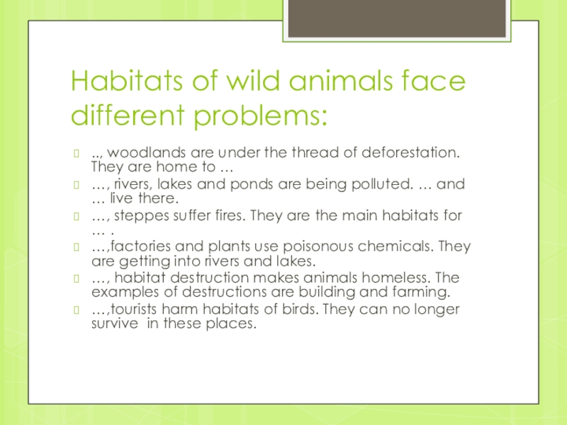 talk about destruction of animals` habitats. You will have to start in 1.5 minutes and speak for not more than 2 minutes (10-12 sentences).