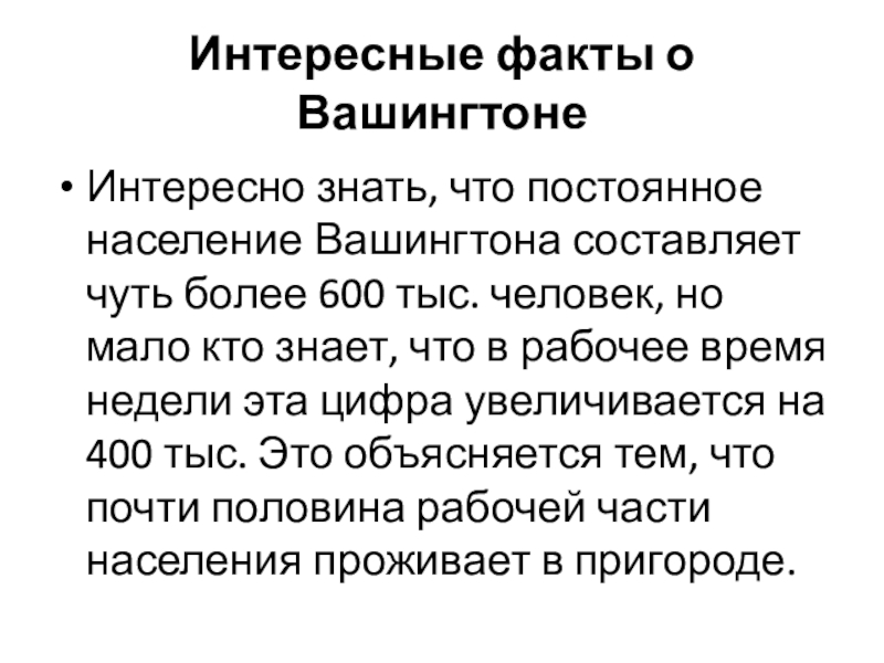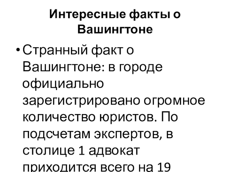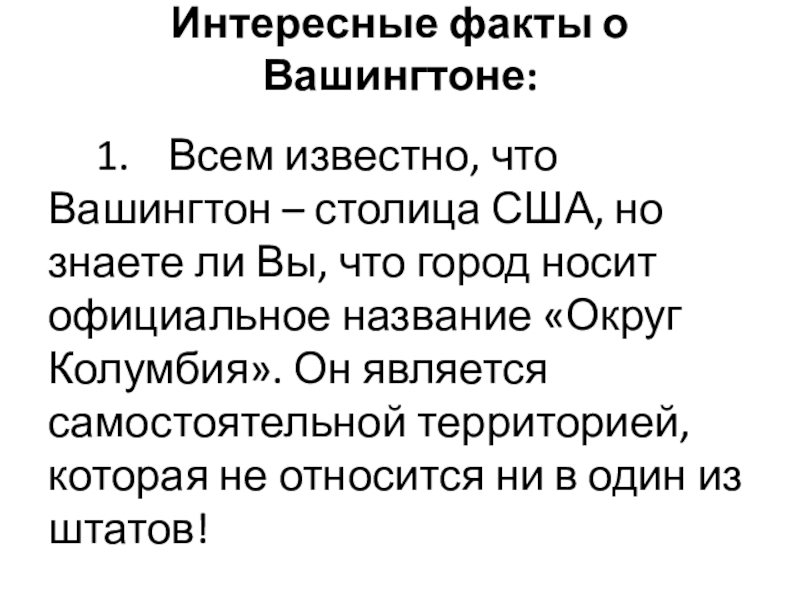 Интересные факты о Вашингтоне:    1.	Всем известно, что Вашингтон – столица США, но знаете ли