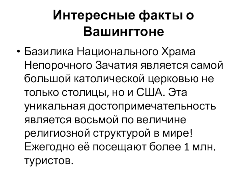 Интересные факты о ВашингтонеБазилика Национального Храма Непорочного Зачатия является самой большой католической церковью не только столицы, но