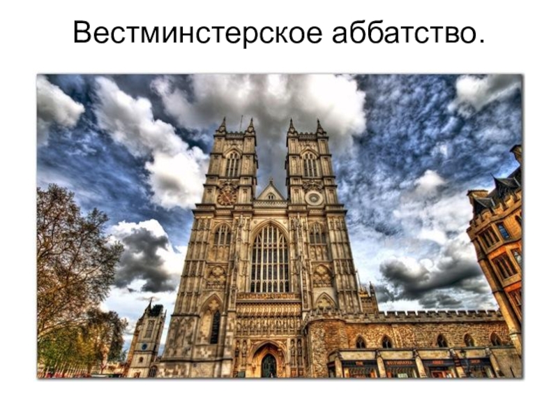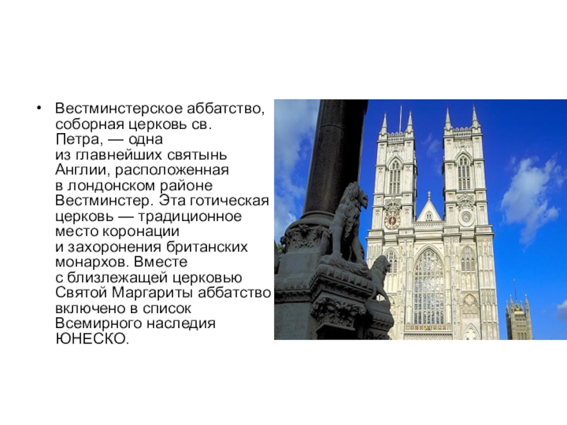 в лондонском районе Вестминстер. Эта готическая церковь — традиционное место коронации и захоронения британских монархов. Вместе с близлежащей церковью Святой Маргариты аббатство включено в список Всемирного наследия ЮНЕСКО.