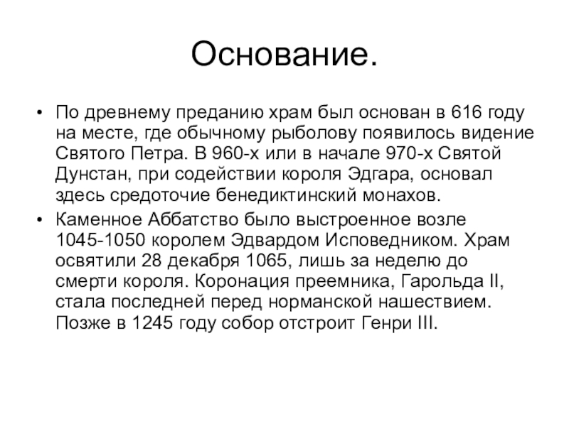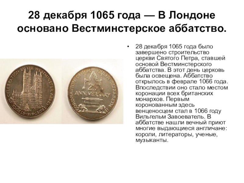 Слайд 828 декабря 1065 года — В Лондоне основано Вестминстерское аббатство.
