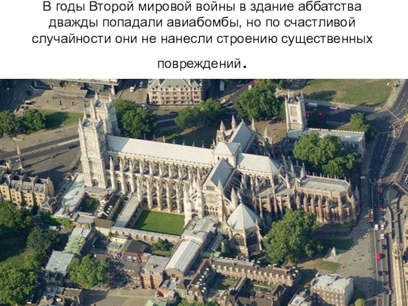 Слайд 24В годы Второй мировой войны в здание аббатства дважды попадали авиабомбы, но по счастливой случайности